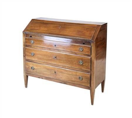 Ribalta in noce a due cassetti e mezzo con calatoia celante quattro tiretti e vano a giorno, gambe rastremate (cm 109x99x46) (difetti e mancanze)