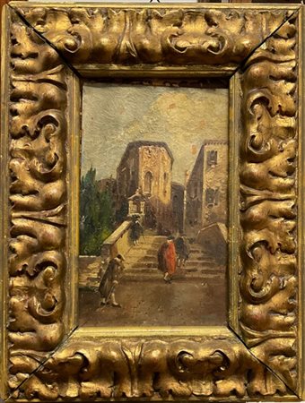 Ignoto del secolo XIX "Scorcio veneziano con figure" olio su cartone (cm 24x1