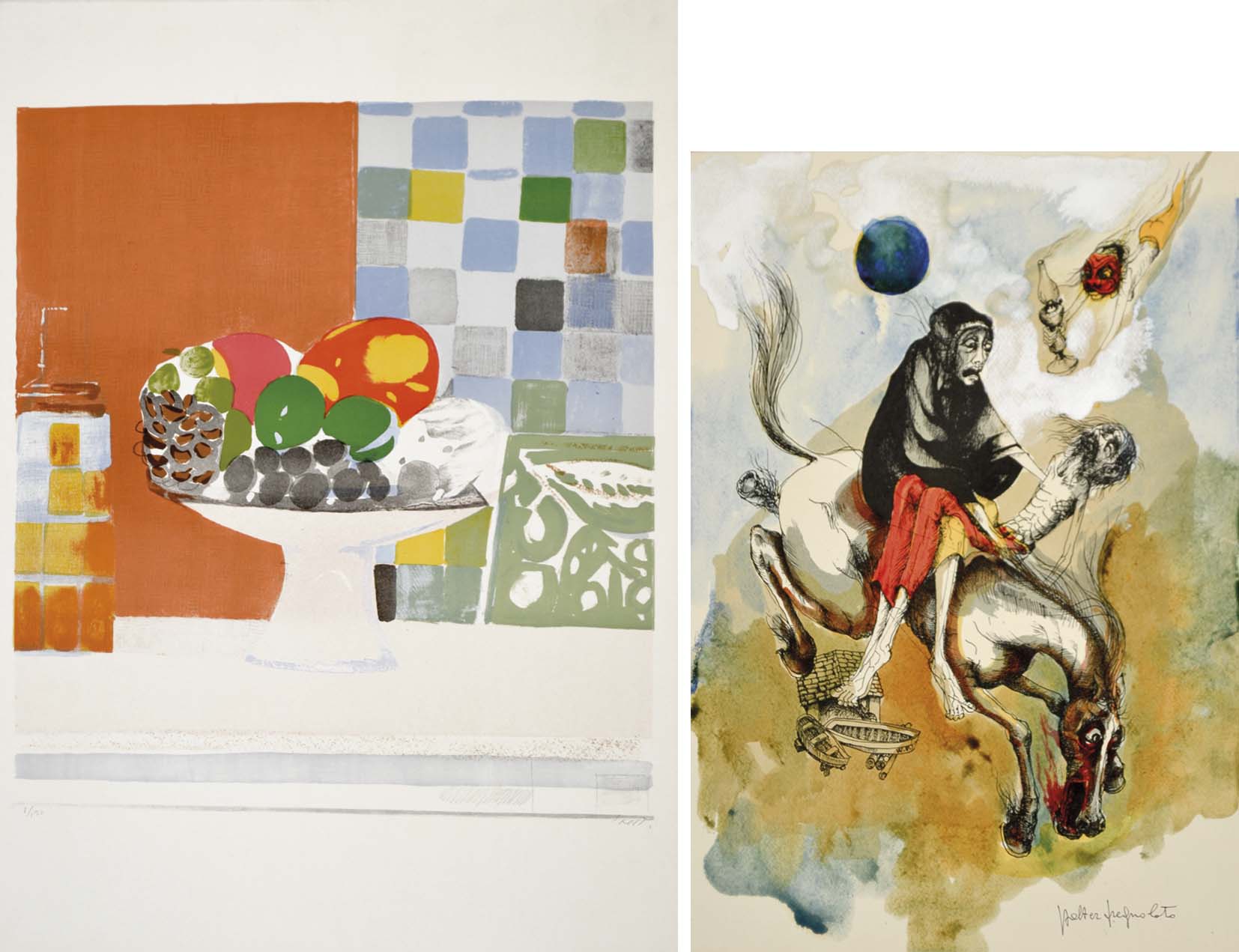 AUTORI VARI Soggetti vari lotto di 2 opere 70x50 - 50x35 entrambe firmate in basso a destra Saetti: Vaso di frutta, litografia es.8/120 Pregnolato: Morte a cavallo, tecnica mista su carta