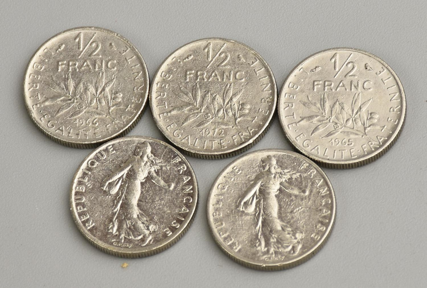 LOTTO DI FRANCHI FRANCESI composto da 5 monete da 1/2 franchi vari anni di...