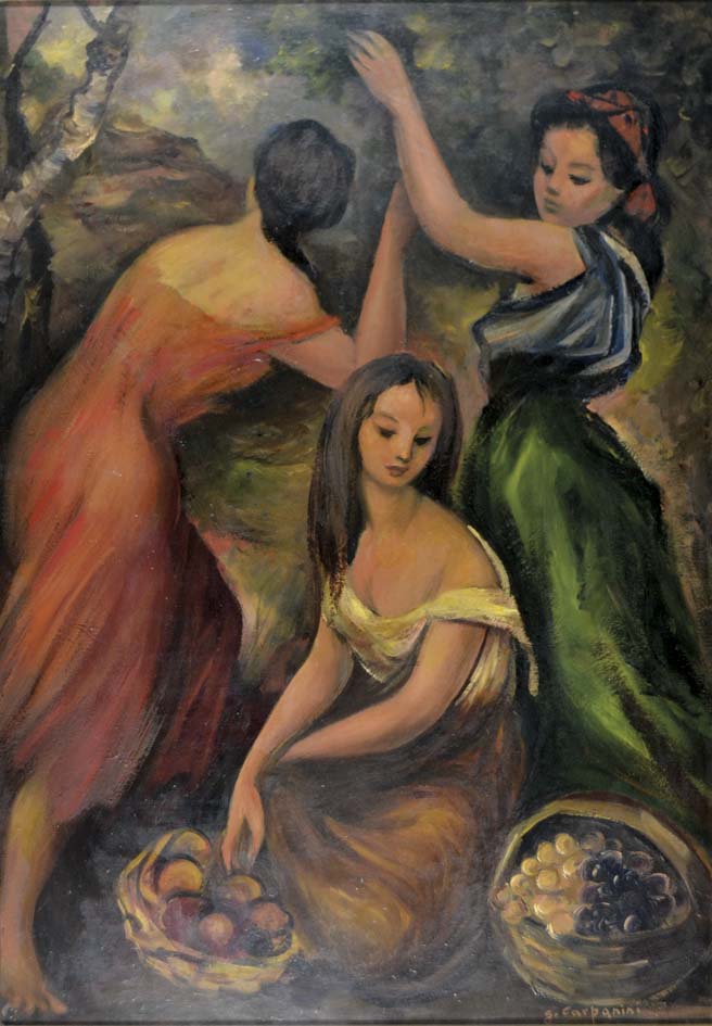 CARPANINI GIORGIO Piacenza 1914 Raccoglitrici di frutta 1967 olio su tela 100x70 firma in basso a destra firma data e titolo al retro autentica dell'Autore su certificato Galleria Patrizia Montecatini Terme - timbri al retro