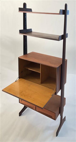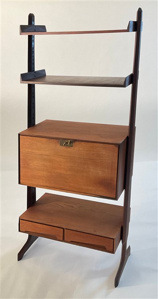Libreria a una campata. Produzione Dassi, Italia, anni '50/'60. Due ripiani sopra vano con anta a ribalta dotata di chiave, e due cassetti nella lunghezza. Teak massello bordato e impiallacciato. (cm 86,5x205x41) (difetti)