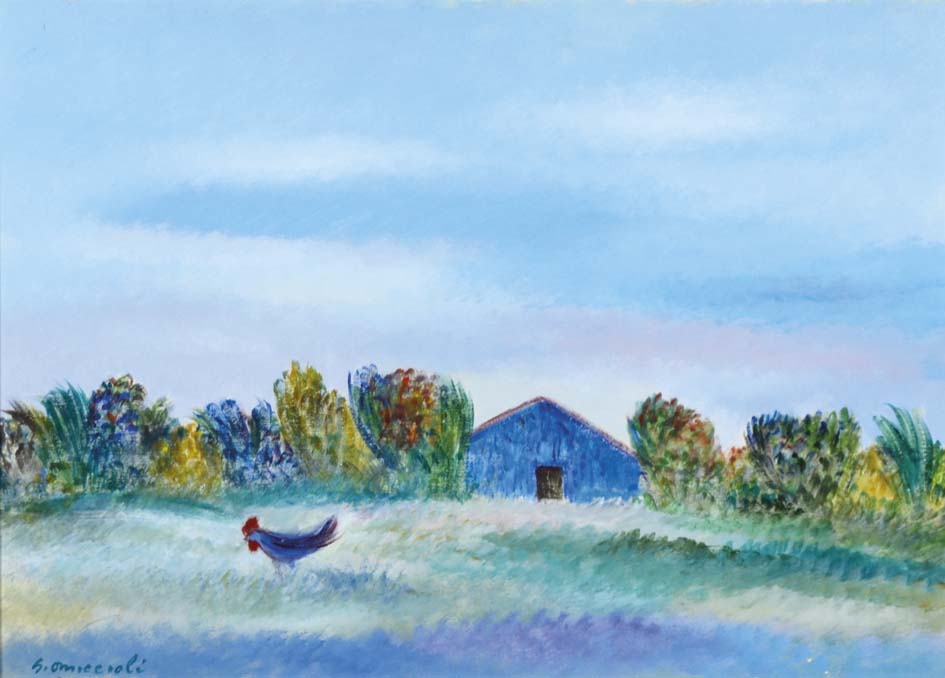 OMICCIOLI GIOVANNI Roma 1901 - 1975 Casa e gallo 1972 olio su cartone pressato 35x50 firma in basso a sinistra firma data e titolo al retro autentica dell'Autore al retro