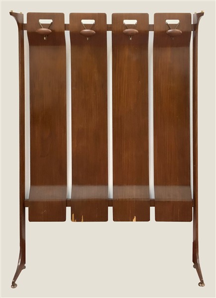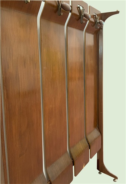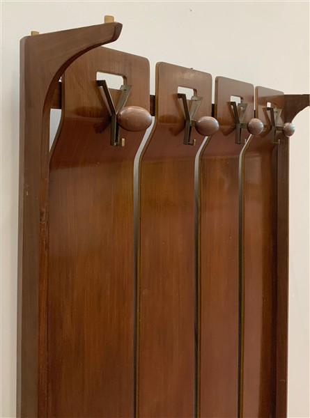 Appendiabiti da parete in legno impiallacciato e curvato. Italia, anni '60. (cm 115x177) (difetti e mancanze)