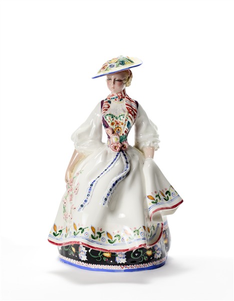 Sculturina raffigurante donna in abito tradizionale reggente un ramo di pesco in fiore. Manifattura Essevi, Torino, 1939. Ceramica bianca formata a colaggio e decorata in policromia sotto vetrina. Firmata e iscritta sotto la base "ESSEVI MADE IN ITALY N. 284 TORINO 31-1-939". (h cm 35) (lievi difetti)