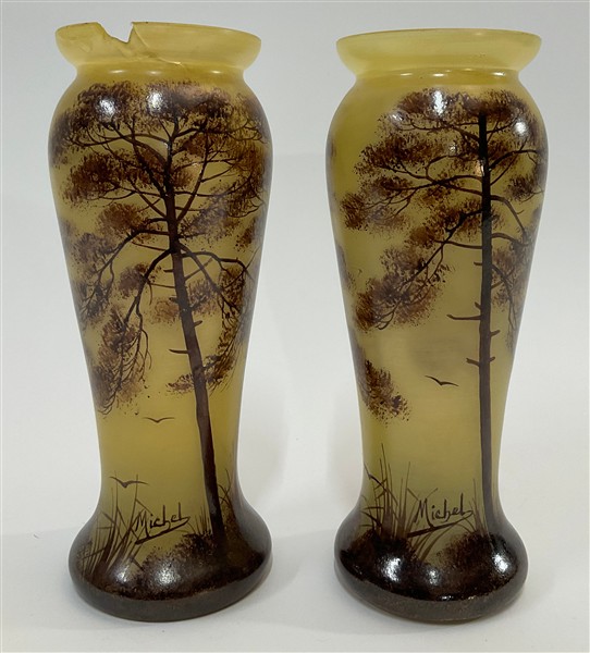 Coppia di vasi in vetro soffiato a stampo nei toni del giallo decorato a smalto con paesaggio, alberi e volatili nei toni del marrone. Prima metà secolo XX. Firmati "Michel". (h cm 25,5) (gravi difetti)
