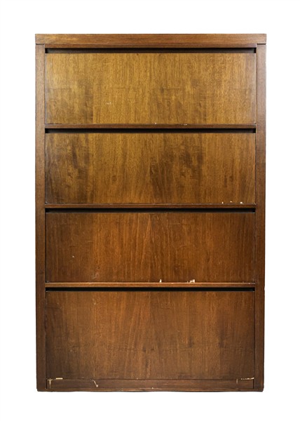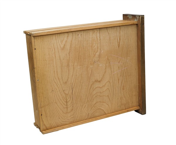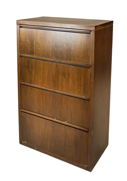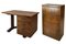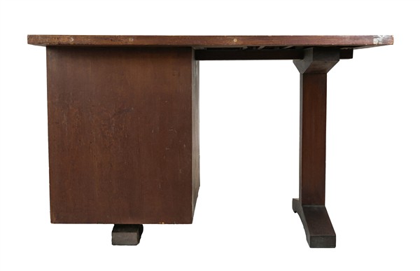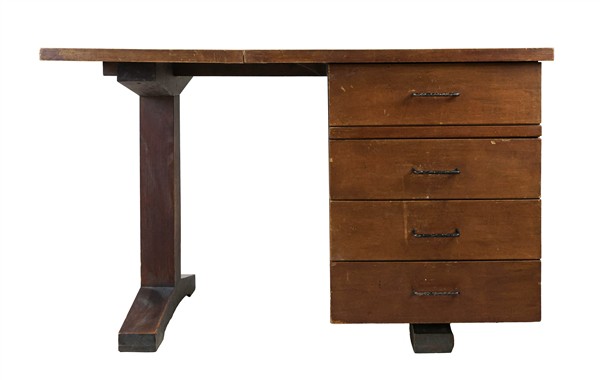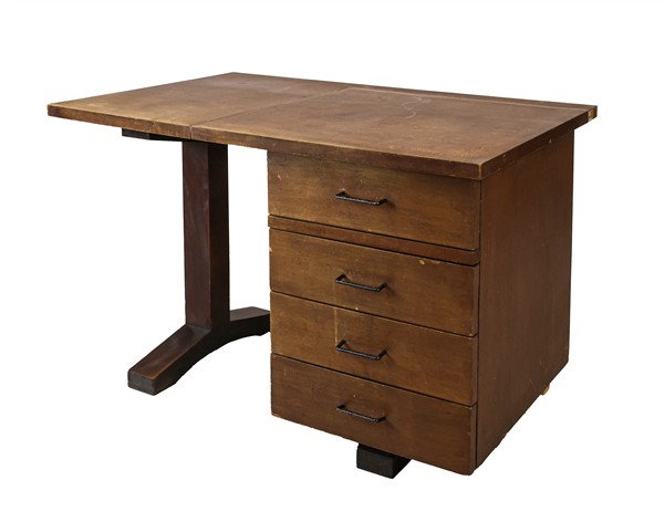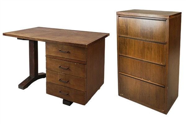 Lotto composto da una scrivania con tre cassetti (cm 120x75x70,5) e una cassettiera con quattro cassetti in legno e compensato (cm 70x109x35). Italia, 4050. (difetti)