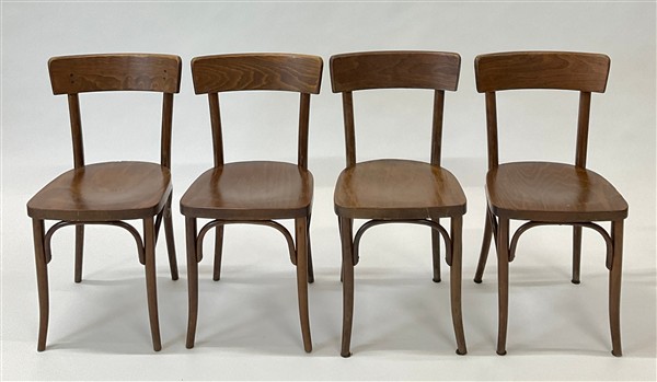 Gruppo di quattro sedie in legno con schienale a giorno. Cecoslovacchia, prima metà secolo XX. Recanti etichetta sotto la seduta e marchio. (cm 42x81x41) (difetti)