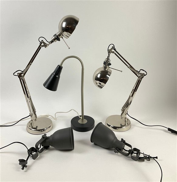 Lotto composto da tre lampade da tavolo, di cui due a pantografo in metallo cromato e una con paralume in metallo verniciato nero, e due lampade a morsetto in metallo grigio. Produzione recente. (h max cm 66) (difetti)