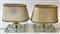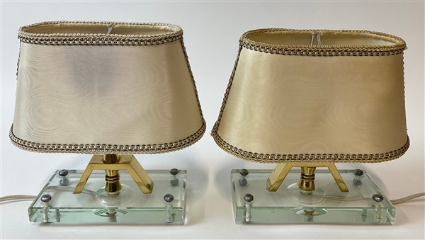 Coppia di abat-jour in metallo ottonato con base in cristallo di forte spessore, con paralumi in stoffa. Italia, anni '90/2000. (h cm 21) (difetti)