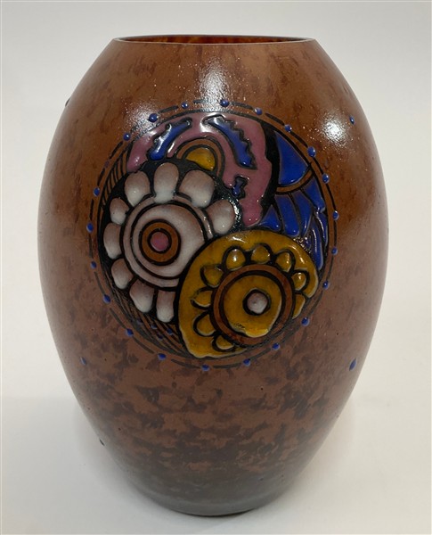 Vaso in vetro maculato decorato a smalti con fiori. Nancy, 1925ca. Firmato. (h cm 17,5)