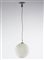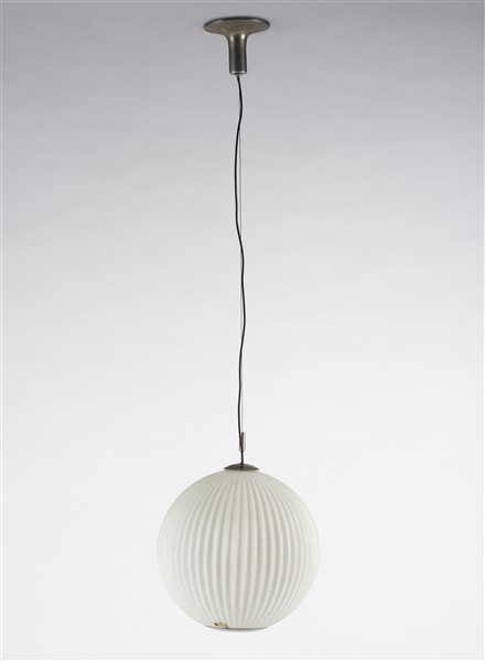 Lampada a sospensione in vetro lattimo costolato e acidato sulla superficie esterna, struttura in metallo cromato. Germania, anni '70. (h cm 140; d cm 40)