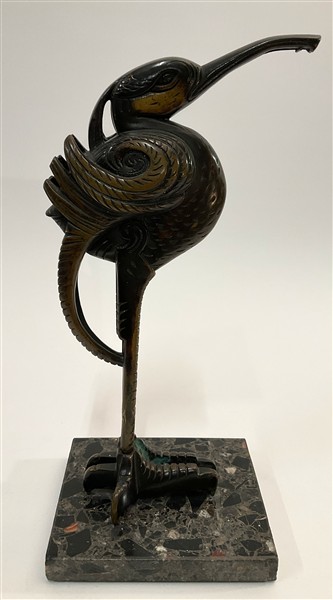 Base di lampada Art Déco a forma di ibis in bronzo su base in marmo nero non coeva. Firmato alla base. (h cm 39) (difetti e restauri)