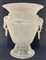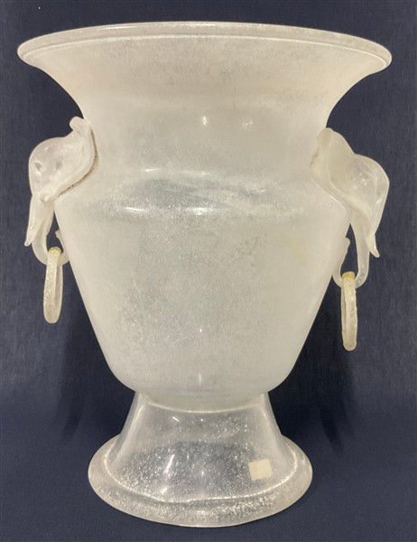 Vaso a cratere in vetro soffiato cristallo decorato a effetto scavo con anse a testa d'elefante che sorreggono anelli. Esecuzione Seguso Vetri d'Arte, Murano, anni '80. Recante etichetta del produttore. (h cm 39,5) (difetti e restauri)