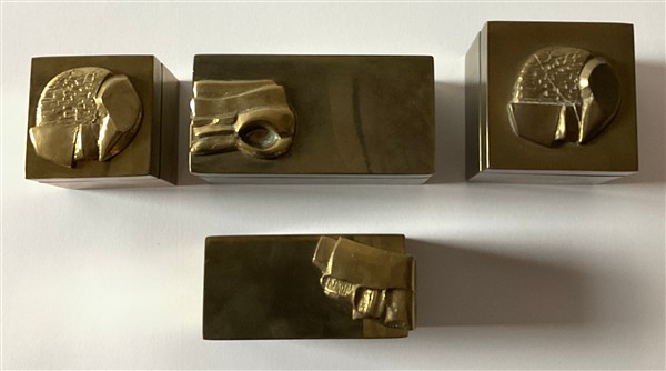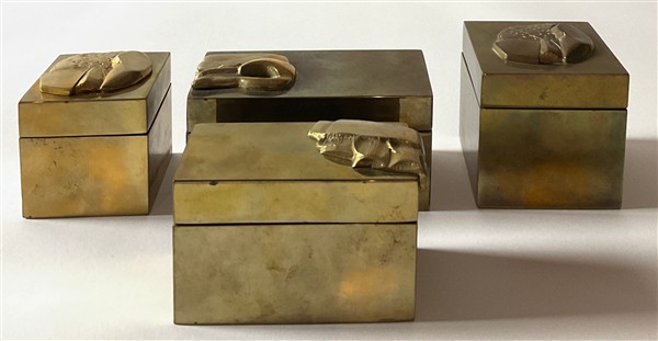 Lotto di quattro scatoline in ottone con decoro informale a rilievo. Italia, anni '70. (cm max 10x6x5)