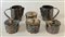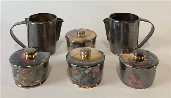 Lotto composto da quattro contenitori con tappo e due versatoi. Italia, anni '40/'50. Metallo argentato. Marcati a incussione sotto la base. (h cm 6; d cm 8,5) (difetti e mancanze)