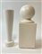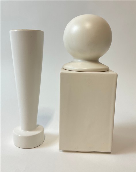 Vaso rettangolare con coperchio con sfera in ceramica smaltata bianca. Unito a un vaso troncoconico in ceramica smaltata bianca. Produzione Sicart, anni '70. (difetti)