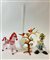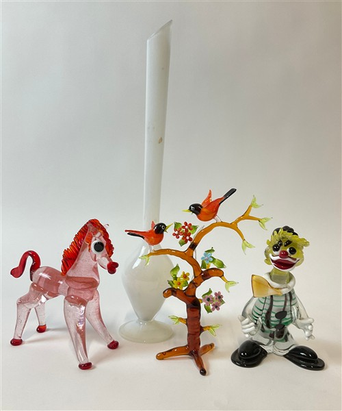 Lotto composto da un vaso soliflore in vetro iridato, un cavallino, un clown e un ramo fiorito con uccelli. Seconda metà secolo XX. (h max cm 39) (difetti e mancanze)