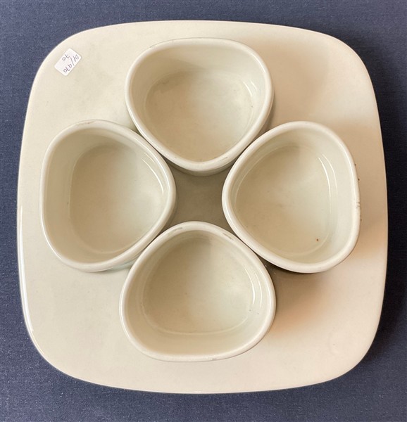 Vassoio con quattro ciotoline in ceramica bianca disposte a quadrifoglio. Produzione Fratelli Brambilla. (cm 23,5x6,5x23,5) (lievi difetti)