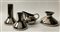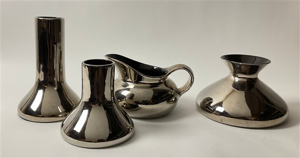 Lotto composto da tre diversi vasi e un versatoio in ceramica smaltata a lustro metallico argenteo. Italia, anni '80/'90. (h max cm 27,5) (difetti e restauri)