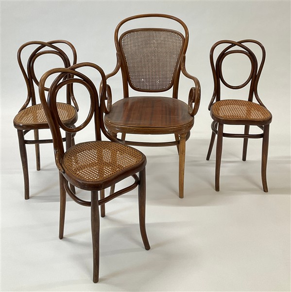 Lotto composto da tre sedie di Jacob & Josef Kohn, una poltroncina Thonet, e un