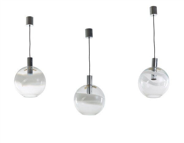 Lotto di tre lampade a sospensione con struttura in metallo cromato e globi diffusori in metallo soffiato trasparente incolore con fascia orizzontale in vetro lattimo. Murano, anni '70. (h cm 90; d cm 30) (lievi difetti)