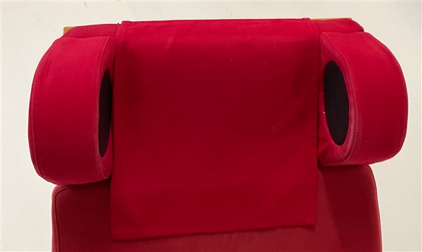 Chaise longue. Struttura in legno e legno tinto grigio, rivestimento in velluto e panno rosso. Sistema audio integrato Bluetooth. (cm 161x94x56) (lievi difetti e restauri)