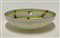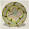 Piatto centrotavola in vetro incamiciato lattimo a decori fenici in vetro rosa, celeste, giallo e bruno opacao. Anni '50. (d cm 22,4)