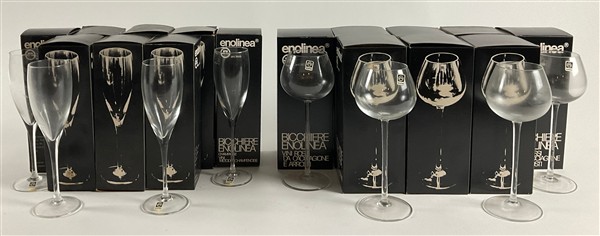 Lotto di tredici flute e dodici calici da vino in cristallo. Italia, anni '70/'80. In scatole originali.
