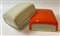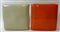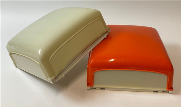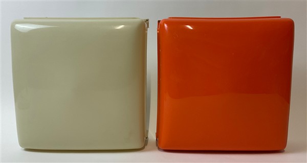 Due lampade a plafone modello "Cnosso". Produzione Artemide, Milano, 1969. Metacrilato arancione e bianco. (cm 32x14x32) (lievi difetti e mancanze)
