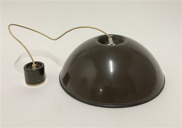 Lampada a sospensione modello "Relemme". Produzione Flos, Milano, anni '60. Metallo verniciato marrone, gomma nera, plastica bianca. (d cm 39) (lievi difetti)