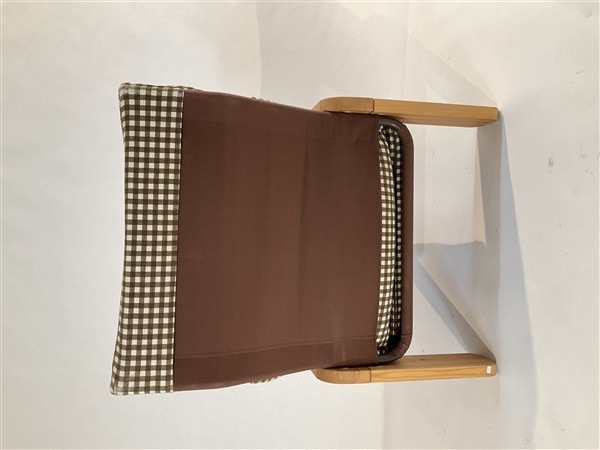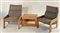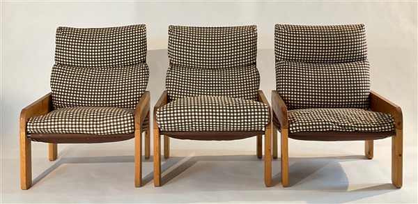 Lotto di cinque poltrone modello "Innovator". Svezia, 1973. Struttura in legno di abete massello e tubolare metallico, schienale e seduta in tela marrone, cuscini rivestiti in tessuto a riquadri bianchi e marroni. Unite a un tavolo da caffè ensuite. (poltrone cm 66x89x78; tavolino cm 71x37x71) (difetti)