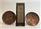 Lotto di due piatti (d max cm 24,5) e una placca (cm 29,5x10,5) montata su pannello in legno. Padova, anni '50. Firma a incussione.