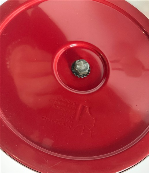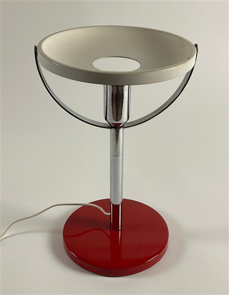 Lampada da tavolo disegnata nel 1923 per la scuola Bauhaus di Weimar. Produzione Imago DP, Italia, anni '60. Metallo cromato e verniciato bianco e rosso, e alluminio. (h cm 35) (difetti)