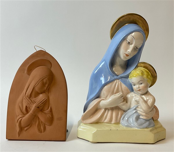 Madonna con Bambino in ceramica policroma (h cm 27) unita ad una placca in terracotta. Firenze, seconda metà secolo XX. (difetti)