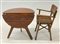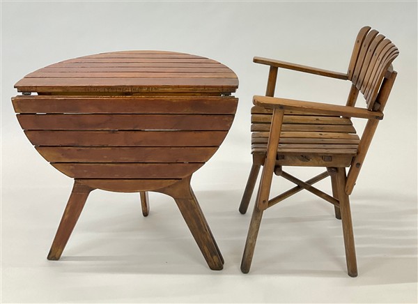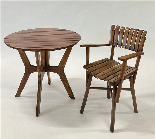 Lotto composto da un tavolo a bandelle (cm 78x70) ed una poltrona da giardino in legno. Italia, anni '70. (difetti e rotture)