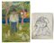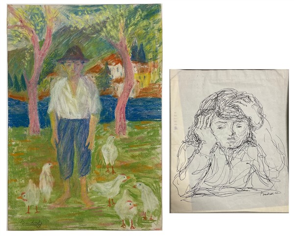 Lotto composto da un pastello su carta raffigurante contadinello e una china su carta con figura femminile