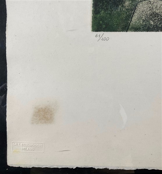 firmata e numerata 61/100 in basso a matita, timbri a secco della Galleria dell'Incisione, Milano e Georges Visat Editions d'art in basso. In cornice (difetti)