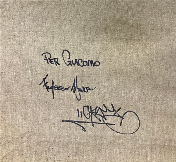firmato e dedicato al retro. Tela arrotolata (difetti)