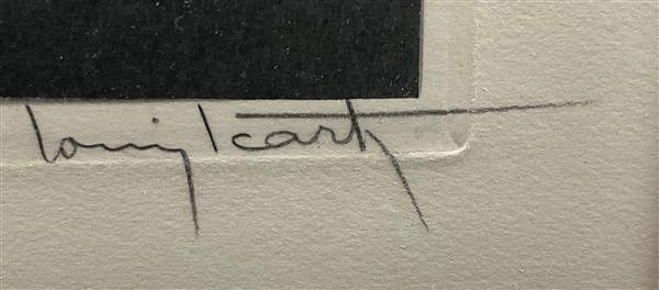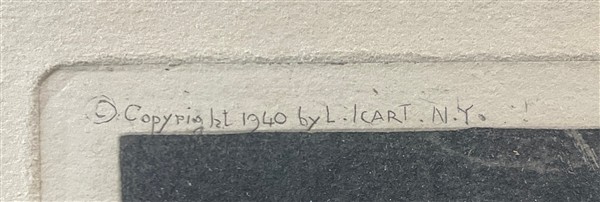 firmata in basso a destra a matita e numerata 215 in basso a sinistra, timbro a secco dell'artista in basso a sinistra. In alto a sinistra, nella lastra "Copyright 1940 by Louise Icart, NY". In cornice