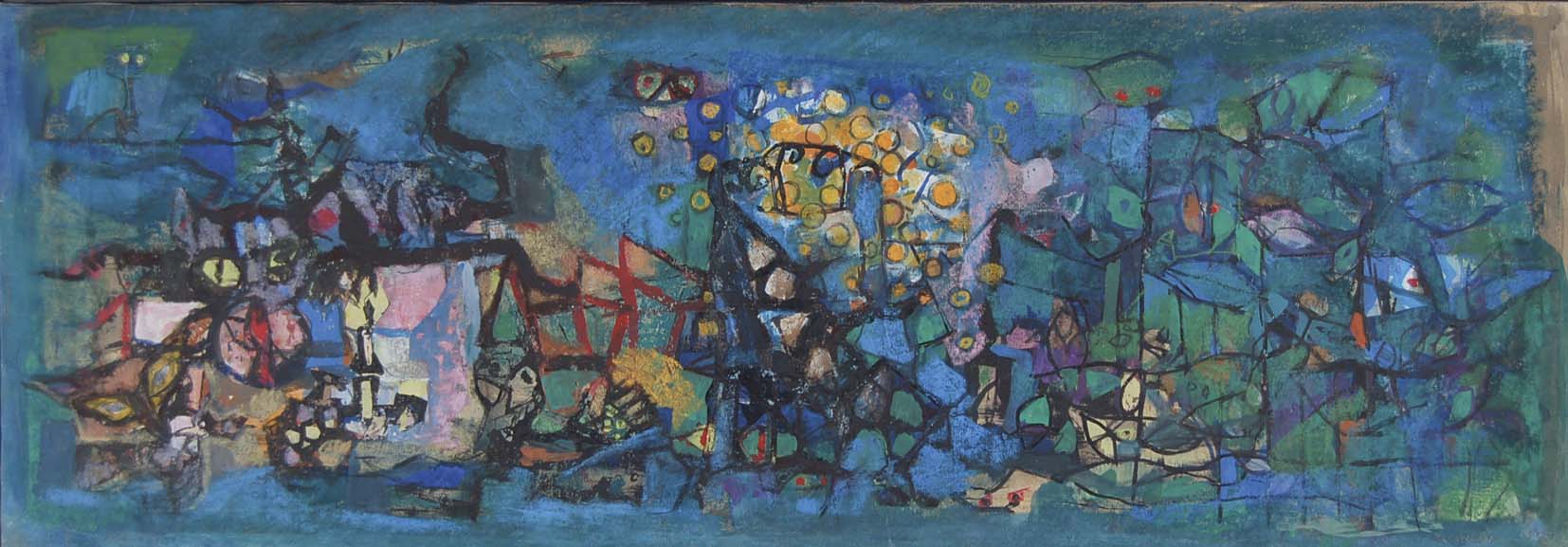 BRUNORI ENZO Perugia 1924 - 1993 Notturno estivo 1956 tecnica mista su cartoncino intelato 36x103 cm firma e data in basso a destra autentica dell'Archivio Brunori a cura del Museo Brunori Forlì