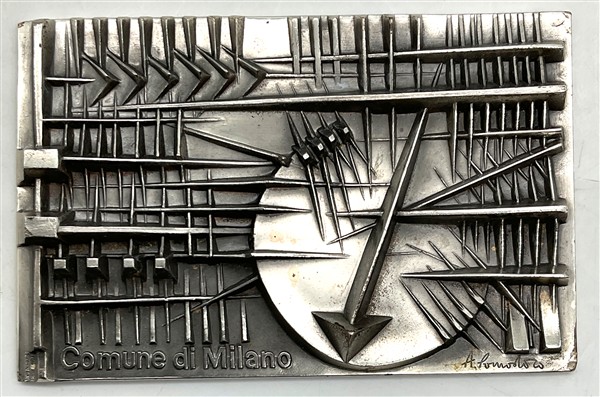 Arnaldo Pomodoro "Targa per Comune di Milano" 1978 bronzo argentato cm 7,5x11,5x