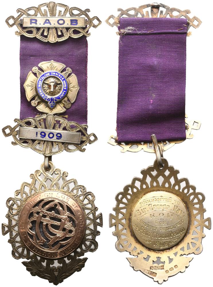 Medaglia Prov. G_d L_ge Of Poole Bournemouth & Dist., R. A. O. B., "Nemo Mortalium Omnibus Horis Sapit", G L E, 1909, AG E Smalti (47 x 134 mm)
