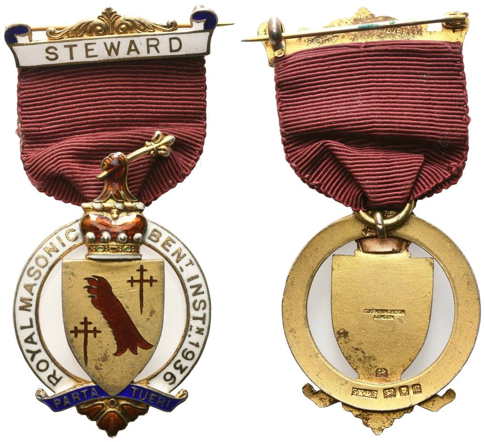 Medaglia Royal Masonic Ben_t Inst_n. 1936, "Parta Tueri", Steward, AG E Smalti (33,4 x 73 mm)