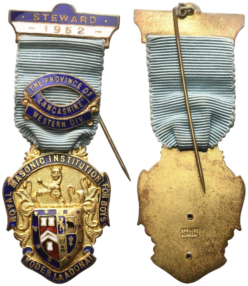 Lotto 37 | Medaglia Royal Masonic Institution For Boys, "Kodes La Adonai", Steward 1952 - The Province Of Lancashire Western Div., AG E Smalti (32,8 x 84,3 mm)