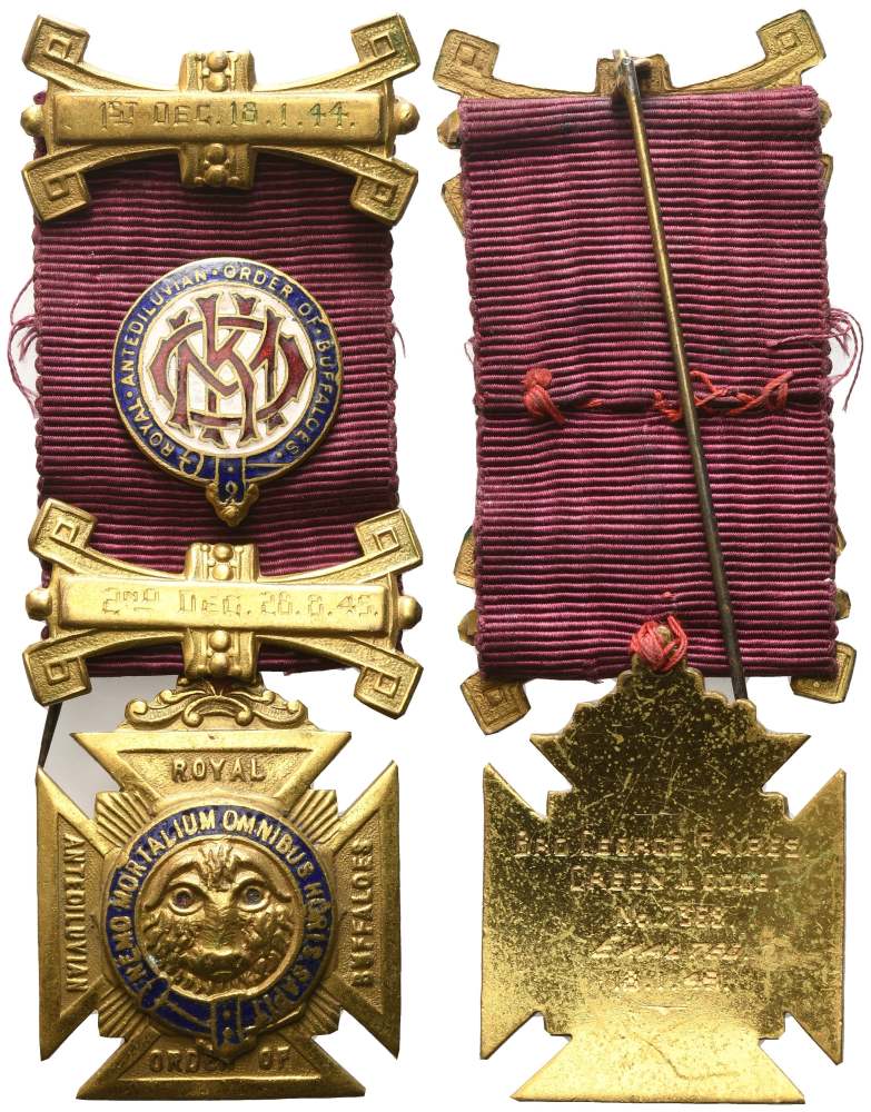 Medaglia Smaltata "Nemo Mortalium Omnibus Horis Sapit", Royal Antediluvian Order Of Buffaloes, 1ST DEG. 18.1.44 2ND DEG. 28.8.45 (33,1 x 94,6 mm)