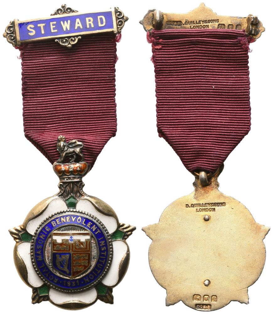 Medaglia Royal Masonic Benevolent Institution - 1931, Steward, AG E Smalti (34,7 x 81,9 mm)