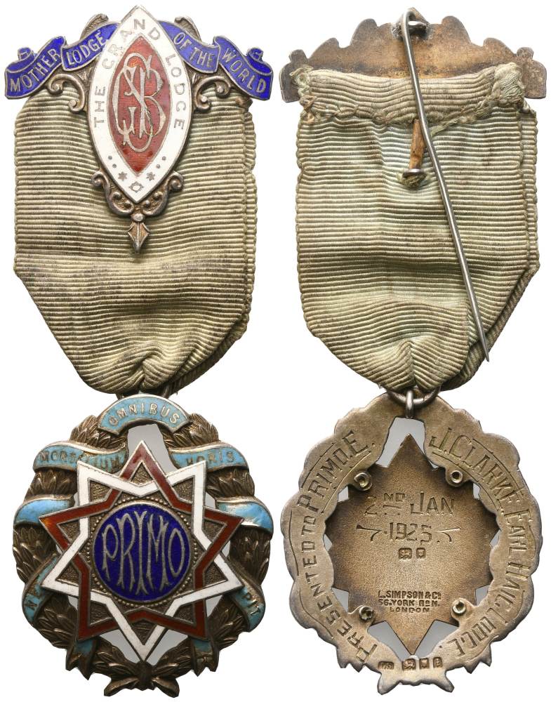 Medaglia PRIMO - "Nemo Mortalium Omnibus Horis Sapit", Mother Lodge Of The World - The Grand Lodge GSB, 1925, AG E Smalti (42,2 x 112 mm)