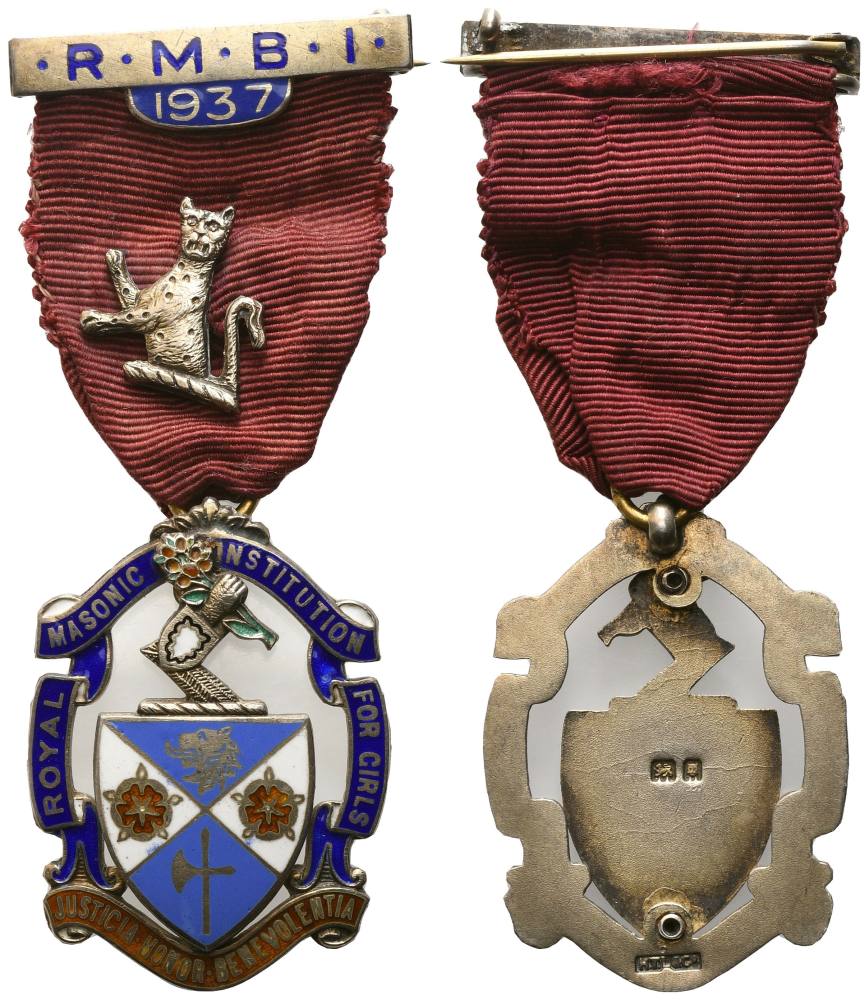 Medaglia Royal Masonic Institution For Girls, "Justicia Honor Benevolentia", R. M. B. I. - 1937, AG E Smalti (27,8 x 81,9 mm)