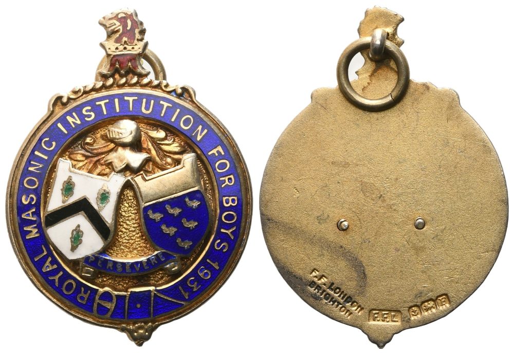 Medaglia Royal Masonic Benevolent Institution For Boys 1931, "Persevere", AG E Smalti (32,6 mm)